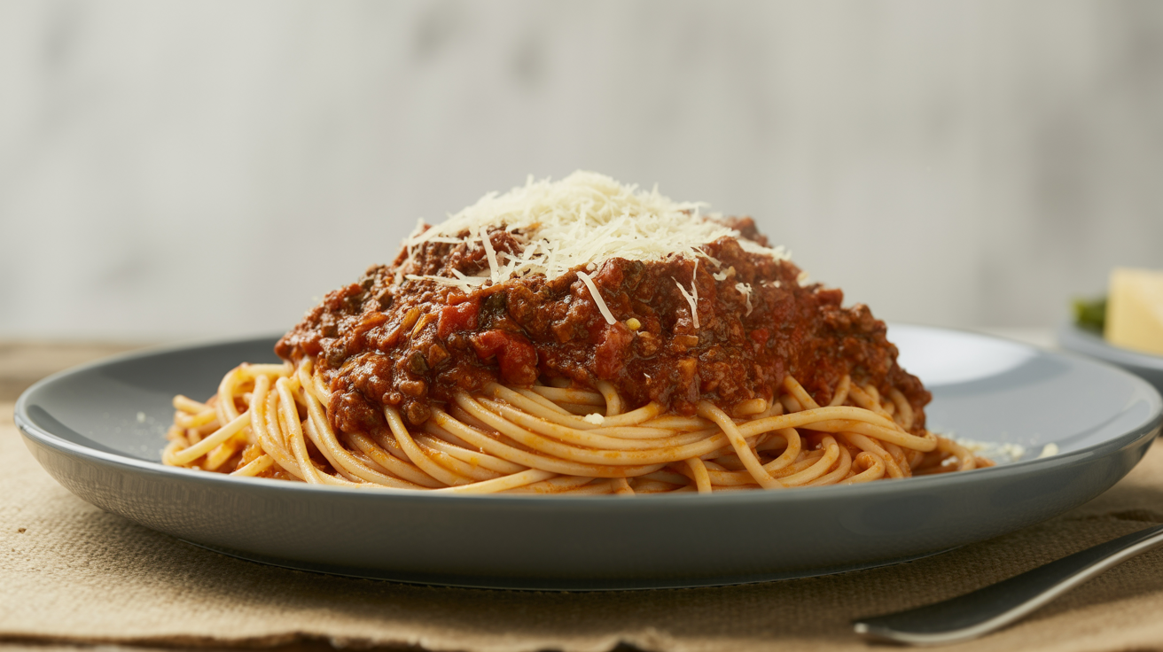 Serve the bolognese sauce over the spaghetti, topped with parmesan cheese.
